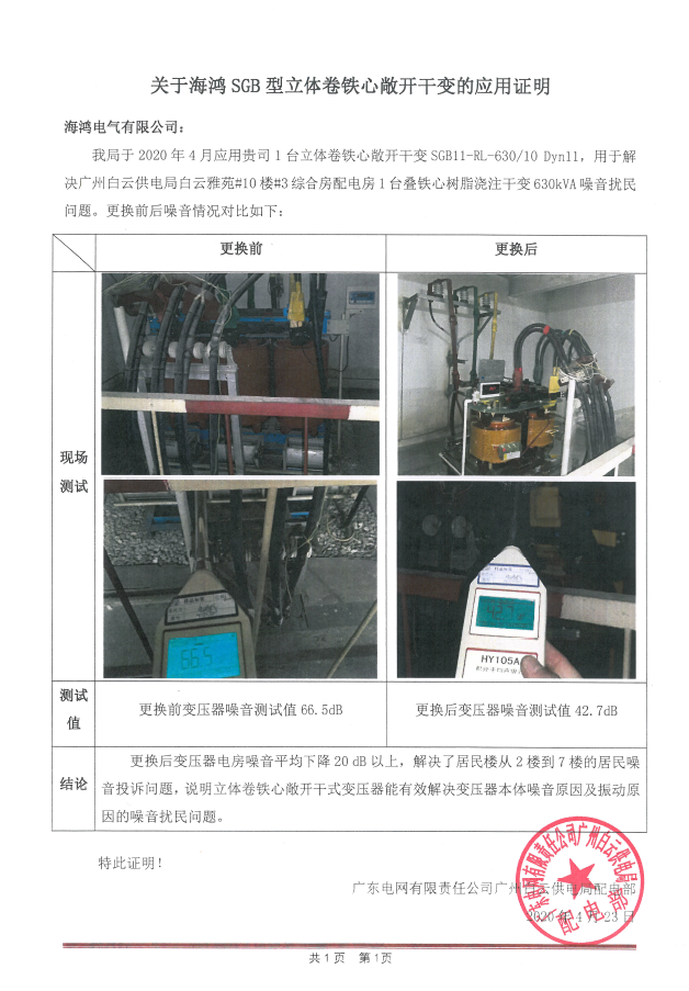 广州白云区白云雅苑10楼综合配电房内一台630kVA的叠铁心树脂浇注干变噪音过大,严重影响2-7楼居民日常休息。广州白云供电局选用九游会j9网站首页电气SGB11-RL-630/10敞开式立体卷铁心干式变压器进行更换,更换后配电房噪音水平从66.5分贝降到42.7分贝。敞开式立体卷铁心干式变压器结构坚固稳定,有效解决变压器器身噪音原因及振动引起的噪音问题。